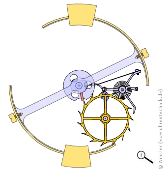 Nebenstehend ist eine Version von Julius Grossmann zu sehen. Sie besitzt eine Sicherungseinrichtung, den kleinen Hebelarm, der während der Auslösung in eine Teilung des Hemmrades geführt wird. Somit wird verhindert, dass während einer Auslösung mehr als ein Hemmradzahn den Ruhestein passiert. Der Hebel wird in diesem Fall von einem Hemmradzahn zurückgedrückt. Desweiteren verhindert dieser Hebel das komplette Ablaufen des Uhrwerkes, sollte ein ungeübter Uhrmacher die Unruhe herausnehmen, ohne das Werk vorher abzuspannen. |