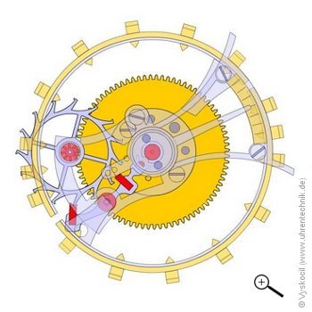 Als Grundlage dieser Animation dienten die Konstruktionszeichnungen des Tourbillons von Es war so um 1800, als Abram Louis Breguet seine Erfindung - die er "Tourbillon" nannte - der Öffentlichkeit vorstellte und die seitdem ganze Generationen von Uhrmachern und Uhrenliebhabern elektrisiert, weil sie auf einem so genialen Grundgedanken beruht und weil sie so verflixt schwer umzusetzen ist. Paul Gerber aus Zürich ist einer der Wenigen, der in der Lage ist, ein Tourbillon zu konstruieren und zu bauen und einer der ganz Wenigen, der ein "fliegendes" (es ist nur einseitig gelagert)in eine Armbanduhr eingesetzt hat. Von Ihm stammen die Pläne zu dieser Animation. Die Grundüberlegung Wenn eine tragbare mechanische Uhr auf dem Rücken liegend mit dem Zifferblatt in den Himmel schaut, dann geht sie anders, als wenn sie aufrecht sitzend (hängend) den Blick noch vorne gerichtet und die Zwölf nach oben in die Ferne blickt. Grund für diese Störung ist die Reibung, die im Liegen kleiner ist als im Hängen. Reibung bedeutet auch immer Energieverlust und somit Änderung der Amplitude (oder Ausschlag) der Unruhschwingung, was eben eine Gangänderung zur Folge hat. Die Uhr ändert ihren Gang auch dann, wenn sie Ihren Kopf neigt und die Zwölf mal nach links, mal nach rechts richtet oder sie sich sogar die Welt kopfüber anschaut. Das liegt unter anderem daran, daß die Unruh nicht exakt ausgewuchtet ist (ähnlich wie ein schlecht ausgewuchteter Autoreifen) und diese Unwucht zieht mal in die eine, mal in die andere Richtung. Je nach Lage der Uhr. Auf genau den letzt genannten Fehler, den der durch die Erdanziehung und eine nicht 100% ausgewuchtete Unruh entsteht, zielt die Erfindung von Abraham Louis Breguet. Er sagte sich: "Ok, wenn ich den Lagefehler im Hängen nicht beseitigen kann, so kann ich ihn aber dadurch in den Griff bekommen, indem ich der Uhr verbiete eine bestimmte Lage für längere Zeit einzunehmen". Gemeint ist damit, daß ein Lagefehler im Hängen nur dann auftritt, wenn die Verweildauer der Uhr in einer Lage größer ist als in allen anderen. (z.B. 14h mit 12 oben, der Rest gleichmäßig verteilt auf die übrigen Stunden) Die Umsetzung Man könnte nun hingehen und die komplette Uhr ständig in der Tasche drehen, um die Bedingung von Breguet, keine Lage dominieren zu lassen, zu erfüllen. Dies ist für die Praxis aber eher ungeeignet. Aber es muß ja gar nicht die ganze Uhr gedreht werden. Es würde ja reichen, nur die Unruh mit Hemmung um sich selber drehen zu lassen. Denn, ob das Federhaus, das Zifferblatt oder sonstwas so oder so steht hat auf den hier besprochenen Fehler keinen Einfluß. Also es ist das Drehen der Unruh mit Hemmung um sich selber, was Breguet mit seinem Tourbillon realisiert hat. Die Herausforderung Ganz so einfach, wie es sich liest ist es nun nicht, die Unruh einfach mal so um sich selber drehen zu lassen. Der Mechanismus, der dafür erforderlich ist, der braucht Kraft und da wo er im Räderwerk angeordnet ist, dicht an der Hemmung, da ist Kraft Mangelware. Also muß der Mechanismus aufs Feinste ausgeführt werden, damit er schön leicht wird und wenig Kraft verzehrt, die er deswegen braucht, weil er ständig beschleunigt (die Hemmung gibt einen Zahn frei) und gestoppt (die Hemmung "hemmt") wird. Diese Forderung nach dem feinen Ausführen tritt immer mehr in den Hintergrund, je langsamer sich das Tourbillon dreht. Der Geschwindigkeitsrekord liegt bei 12s (selten. Potter), dann kommen 60s (üblich) und es geht dann hoch auf 4min (auch üblich) bis hin zu 1h (selten). Aber je langsamer sich das Tourbillon dreht, desto schlechter wird die Forderung von Breguet erfüllt. Eine Zwickmühle, wie so oft im Leben. Und weil es eben so eine verdammt enge Zwickmühle ist, gibt es nicht viele Tourbillons und es konnten nur die Besten Uhrmacher welche schaffen, die auch wirklich liefen! Daher gibt es nur Tourbillons in Edeluhren (von einigen Ausnahmen abgesehen). |
