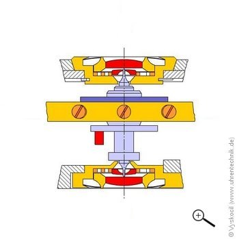 Hier weichen bei axialen Stößen die federnd gelagerten Decksteine aus und bei radialen Stößen, die ebenfalls federnd gelagerten Lochsteine. Sie weichen jeweils soweit aus, bis der Unruhwellenansatz an die entsprechende Lagerschale anstößt und somit die Stoßenergie absorbiert. |